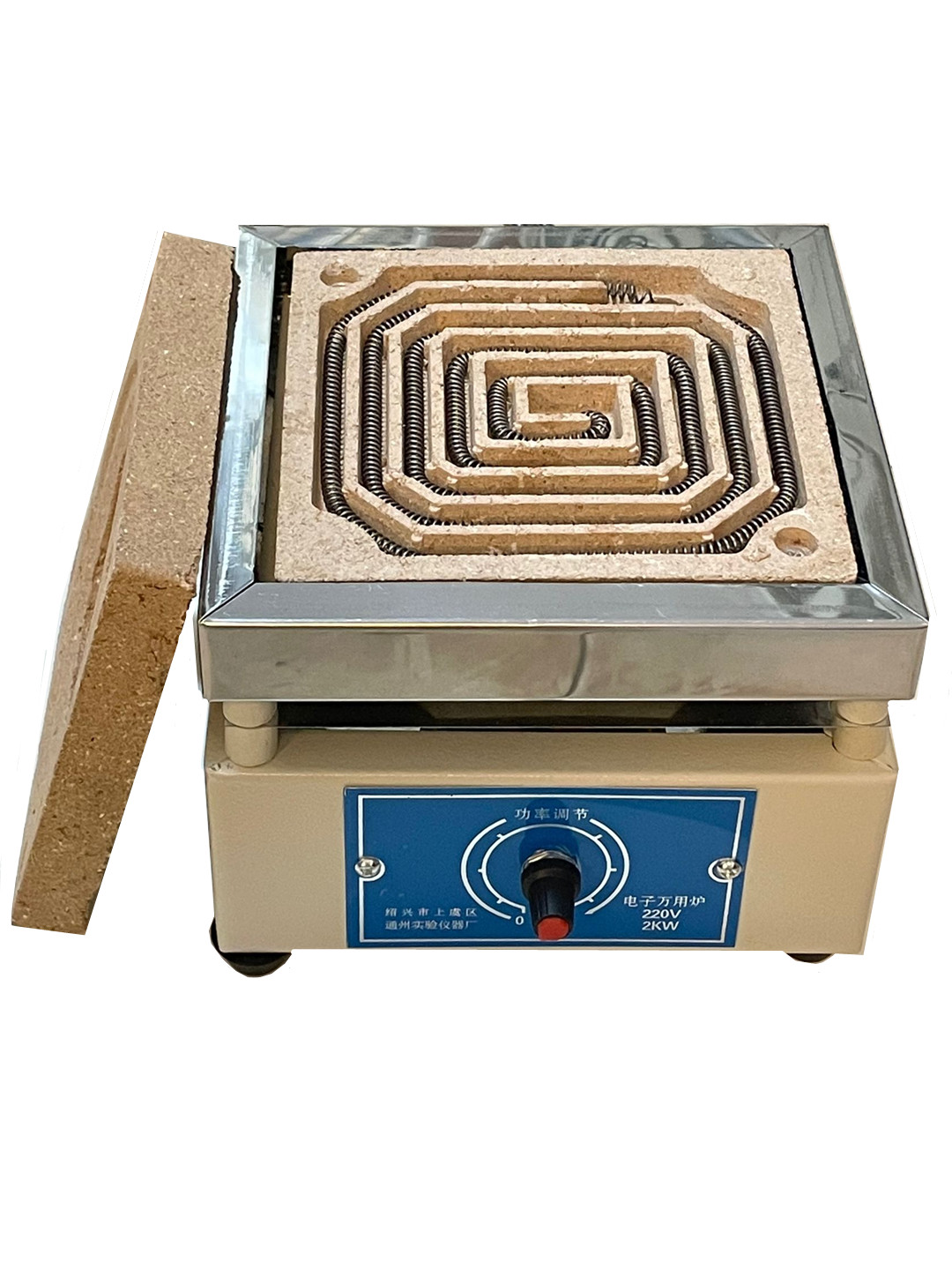 電熱器爐身采用薄鐵皮制成,頂部放有雙面可用耐火泥爐圈,以放置各種圓底或平底器皿用,電熱絲在絕緣耐火泥凹槽內(nèi),爐溫高低有旋鈕調(diào)節(jié),調(diào)節(jié)按順時針方向轉動,功率從小到大,調(diào)節(jié)方便。